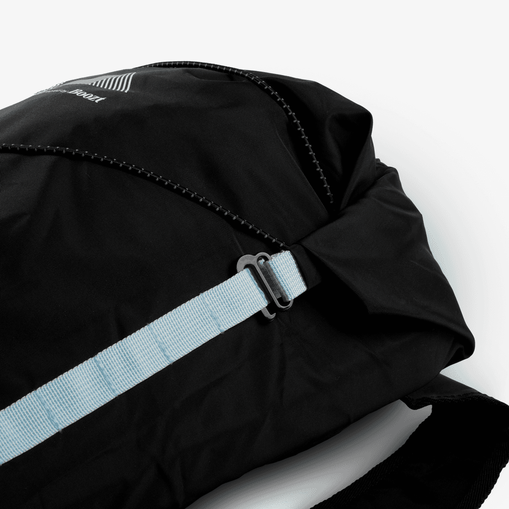 The rolltop closure removes the need for a zipper, reducing both cost and production complexity. Using only two G-hooks and stitched loop webbing, the bag gains a fully adjustable opening without extra hardware. Users can roll and secure the top at different heights, keeping the design flexible, minimalist, and budget-friendly.